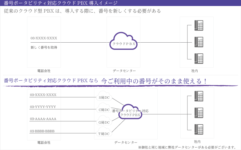 クラウドPBXとは、各拠点で物理的に構築しなければならなかった交換機機能を、インターネット等を経由し、 サービスとしてご提供するものです。 かつてはWEBサーバー、メールサーバー等も自社で機器を調達・構築して運用するのが一般的でした。 それらはレンタルサーバーなどの出現によって、クラウドサービスへの移行が進んでおります。 同じようにビジネスフォンをはじめとする電話サービスにおいても、クラウド化が強く望まれるようになりました。 また、社員ひとりひとりにPHSやスマートフォン等のモバイル端末を支給する企業が増える一方で、 既存の社内電話システムとの連携が難しいケースが多く、非効率な状況が多々ございました。 このような風潮のなかで、アドバンスドクラウドではお客様に高価なPBXをご用意頂くことなく、 「IP電話」 「携帯電話」 「既設PBX」 「Asterisk」の内線化を可能にするサービスを開始致します。 「保留転送」「グループ着信」「電話会議」「ロケーションフリー通話」などの電話システムやクラウドFAXにも対応しており、 初期費用の削減・短期間での構築・内線通話によるコスト削減等を実現致します。 また、従来のクラウドPBXとの大きな違いとして、弊社の番号ポータビリティ対応クラウドPBXは、 現在ご利用中の番号が、御社と同じ地域に弊社データセンターがある場合、番号を維持したまま、クラウド型PBX移行が出来ます。 これにより、番号が変わってしまうことなく、クラウド型に移行できます。